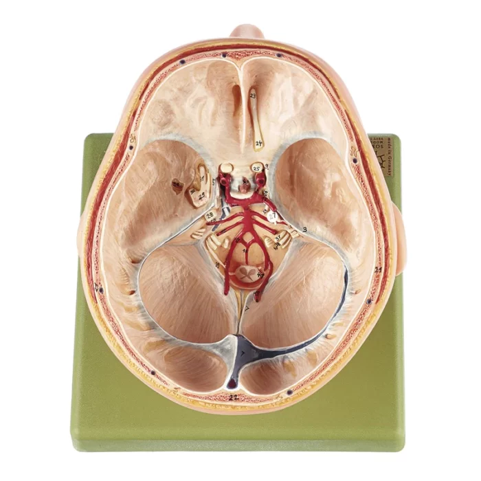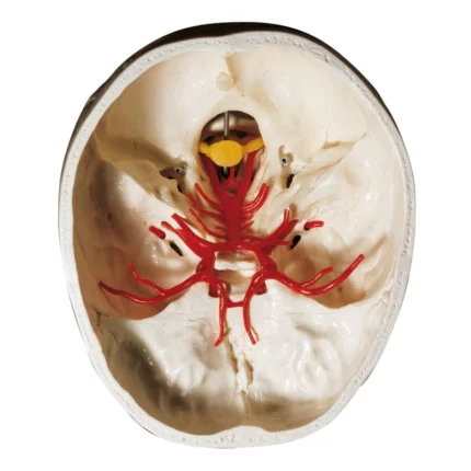 Natural casting in SOMSO-Plast®, consisting of base of skull, mandible and cervical vertebrae with nerves. Representation of cervical arteries with internal passage through the base of skull with emphasis on basilar artery with complete circle of Willisi. Model in one piece. Movable on stand with green base. Height: 26 cm., width: 18 cm., depth: 21 cm., weight: 1.2 kg