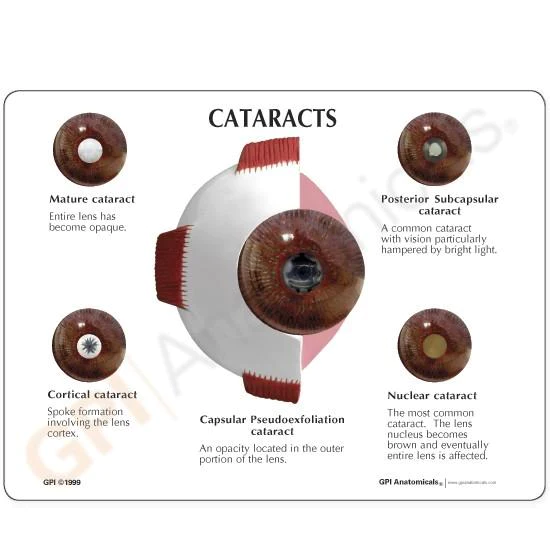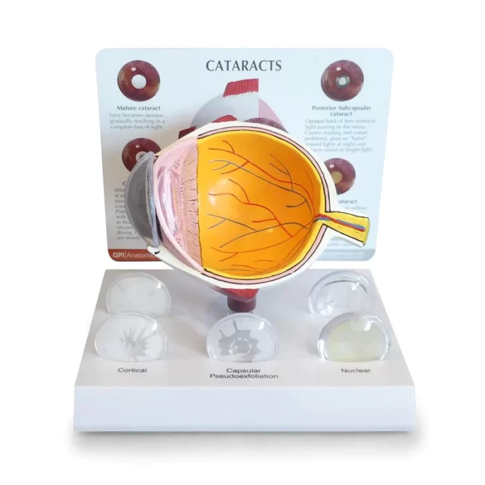 Cataract Eye Model, Product Details: This normal oversized eye model includes interchangeable lenses that show various types of cataract conditions including: subcapsular, capsular, mature, cortical and nuclear. The education card highlights the visual effect of cataracts. Cataract Eye Model Dimensions: Cataract Eye Model Size: 5″ x 3″ x 4″ Cataract Eye Model Card Size: 6-1/2″ x 5-1/4″ Cataract Eye Model Base Size: 6-1/2″ x 5″ x 1″