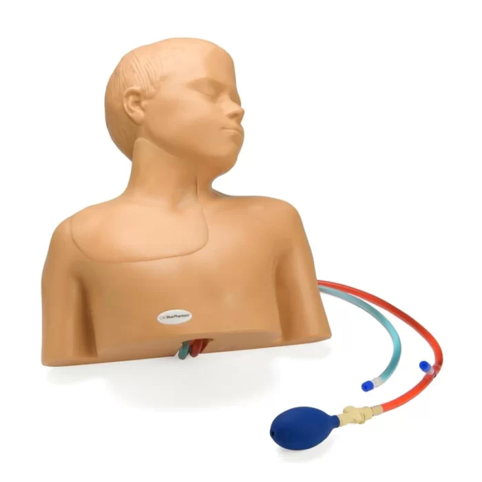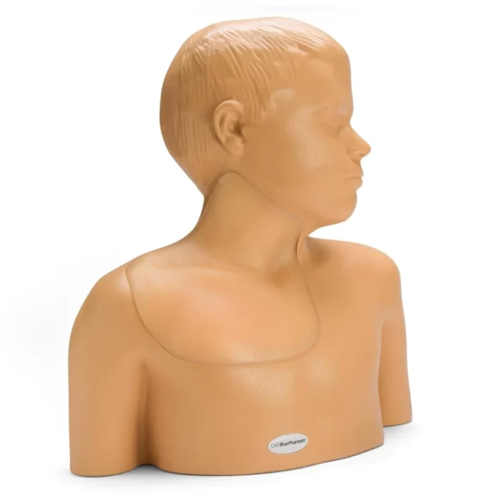 Pediatric Regional Anesthesia Central Line Model offers anatomically correct brachial plexus and vascular access anatomy of the upper thorax and neck. This next generation ultrasound mannequin contains improved anatomy for nerve blocks including the supraclavicular nerves, interscalene nerves, infraclavicular nerves and enhanced access of the posterior interscalene nerve block approach. Vascular access anatomy includes the internal jugular vein (IJ), brachiocephalic vein, subclavian vein, axillary vein, carotid artery, subclavian artery and axillary artery. The model can be accessed via the internal jugular (IJ), subclavian, infraclavicular and supraclavicular approach as well as the axillary vein. The simulated superior vena cava, right atrium and right ventricle offer users the ability to fully thread guidewires, dilators and catheters without resistance just as you would expect with a live patient. Pediatric central line simulator also includes internal landmarks such as the trachea, suprasternal notch, manubrium and clavicle. This model is excellent utilizing traditional external landmarks for blind insertion central line placement or using ultrasound to guide the central venous access procedure. The brachial plexus can be injected with simulated anesthetics to verify needle tip location and to practice the entire anesthesia procedure. Injected simulated anesthetics are expelled allowing for repeated use.