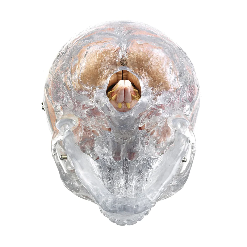 Transparent Skull: removable vault, lower jaw movable, separates into 3 parts.