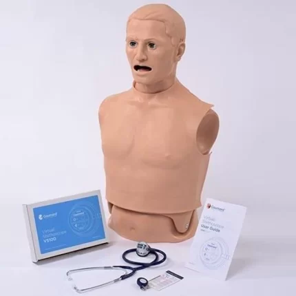Heart and Lung Sounds Adult Torso The amazing technology that simulates the various heart and breath sounds is hidden within the stethoscope bell itself. There are no bulky boxes or transmitters, making it easy to use and realistic. Simply press the bell against the simulator’s skin at the correct anterior or posterior auscultatory site and listen to the corresponding sound. The VS100/VS105 include a reference key card that indicates the auscultatory sites locations and the sound types available. Additionally, the package includes a set of optional loud speakers useful when teaching an audience. Features Hear the appropriate heart or lung sound as bell of stethoscope is moved across the front and back of the torso Full size adult torso with palpable anatomic landmarks Sensor network hidden beneath the skin Includes our Virtual Stethoscope® with multiple heart and lung sounds Instruction manual An external speaker plugs into the Virtual Stethoscope so a classroom can hear what the student hears Carrying bag